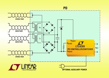 日前,凌力爾特公司 (Linear Technology Corporation) 推出 IEEE 802.3at 兼容的以太網供電 (PoE+) 接口控制器 LTC4269-1、LTC4269-2 和 LTC4278,這些器件具有集成的開關穩壓器,面向高達 25.5W 及更高功率的大功率受電設備 (PD) 應用。新的 IEEE 802.3at 定義 (也稱為 PoE+ 標準) 同時擴大了功率預算,改善了供電設備 (PSE) 和受電設備用來互相識別的分級機制。LTC4269 和 LTC4278 支持兩事件分級,與 IEEE 802.3af 設備是向后兼容的,為進一步提高以太網供電應用的水平創造了條件。這些器件集成了 PD 控制器、以及一個同步反激式控制器 (LTC4269-1 和 LTC4278) 或同步正向控制器 (LTC4269-2),以實現一個完整的 IEEE 802.3at PD控制解決方案。