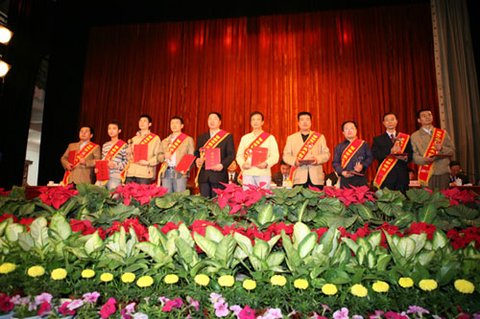 2008年西安市職工技術(shù)創(chuàng)新標(biāo)兵上臺(tái)領(lǐng)獎(jiǎng)并合影留念