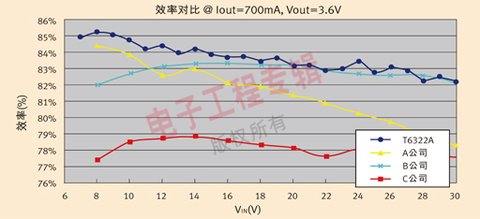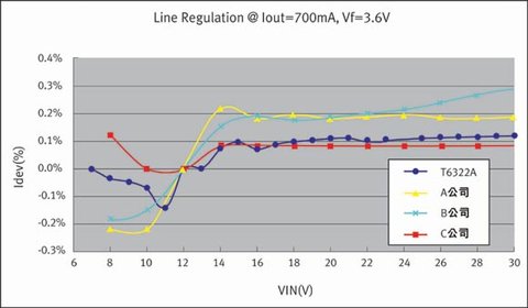 圖1對T6322與其它產(chǎn)品的功率轉換效率進行了對比。圖2是T6322與其他產(chǎn)品的線路調整能力的對比(低電流變動率即表示高線路調整能力)。