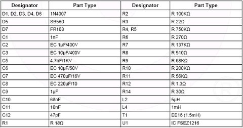 下表介紹了FSEZ1216的主要特性,功能方框圖和典型應用框圖以及5W(5V/1A)電源應用電路和所用材料清單。