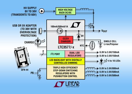 凌力爾特公司 (Linear Technology Corporation) 推出高度集成的多功能電源管理集成電路 (PMIC) 解決方案 LTC3577、LTC3577-1、LTC3577-3 和 LTC3577-4,這些器件用于便攜式鋰離子/聚合物電池應用。LTC3577/-X 在扁平 4mm x 7mm QFN 封裝中集成了一個 USB 兼容的線性電源通路 (PowerPath™) 管理器、一個獨立電池充電器、過壓保護 (OVP)、用于 10 個 LED 的驅動器、按鈕接通/關斷控制、3 個高效率同步降壓型穩壓器和兩個 LDO。LTC3577-1 和 LTC3577-4 具有 4.1V 電池浮動電壓,以改善電池周期壽命并實現額外的高溫安全裕度,而 LTC3577 和 LTC3577-3 含有標準 4.2V 電池浮動電壓,以最大限度延長運行時間。LTC3577-3 和 LTC3577-4 是為 SiRF Atlas IV 芯片組定制的。這些 IC 非常適用于便攜式設備應用,包括個人導航設備 (PND)、數字媒體/視頻廣播 (DMB/DVB) 設備、數字/衛星無線電設備、媒體播放器、通用遙控器、照片觀看設備以及便攜式醫療和工業設備。