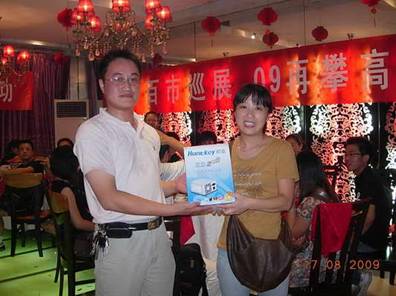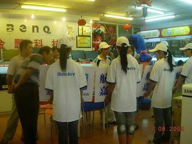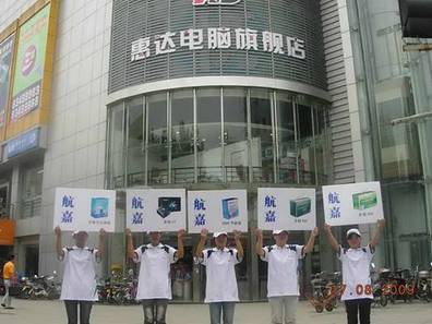 航嘉產品工程師胡逢橋和渠道培訓師蔣子富帶領的渠道巡展隊伍,浩浩蕩蕩邁地進電腦城。聰明伶俐的航嘉吉祥物“嘉嘉”,緊隨促銷隊伍之后,向經過的經銷商們招手致意,讓整個賣場的變得非常活躍。