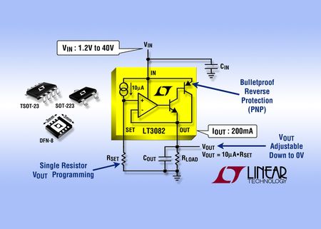 凌力爾特公司 (Linear Technology Corporation) 推出了新一代線性穩壓器系列的最新成員 LT3082,該器件可用單個電阻器調至 0V,非常容易并聯以獲得更大電流。LT3082 200mA PNP 低壓差穩壓器 (LDO) 采用一種電流基準和電壓跟隨器的新架構。這種架構用少量 PCB 走線作為鎮流電阻器,允許多個穩壓器并聯和輸出電流共享。電流共享將熱量分散到一個全表面貼裝系統中。豐富的保護功能包括電流限制和熱限制、以及針對穩壓器和負載的反向輸入保護。