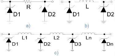 圖1:常見EMI/RFI濾波器類型的結構示意圖:a) π型RC;b) π型LC;c) LC梯形