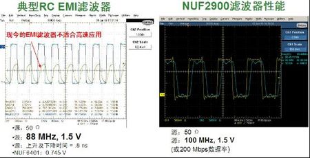 圖4:典型RC EMI濾波器與高速LC EMI濾波器(NUF2900)的響應性能比較。