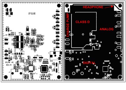 圖3是一個具有較好接地分布的電路板實例(即絲印層和地層舉例),圖3(a)為應元件布局A(正)面,圖3(b)為應元件布局B(背).首先需要注意PCB底部為數字區域,頂部為模擬區域。穿越區域邊界的唯一信號線是I2C控制信號,這些信號線有一個直接的返回路徑,確保數字信號只存在于數字區域,沒有地層分割導致的數字地電流。還要注意大部分地平面是連續的,即使數字區域有一些中斷,但彼此之間的距離足夠遠,保證了電流通道的順暢。在這個例子中,星形接地點在PCB頂層的左上角。模擬地層的斷點確保D類放大器和電荷泵的電流直接返回星形接地點,不會干擾其它模擬層。另外,還需注意耳機插孔有一條引線直接將耳機地電流返回到星形接地點。