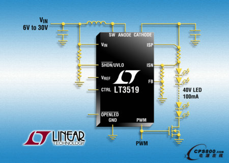 LT3519 在 LED 的高端檢測輸出電流,從而可實現降壓、降壓-升壓或升壓型配置。結合傳統電壓反饋和獨特的浮動電流檢測反饋,這些轉換器可以作為恒定電壓或恒定電流源工作,從而提供最大的設計靈活性。其它特點包括:開路 LED 保護、軟啟動和熱保護。