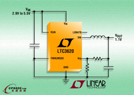 凌力爾特公司 (Linear Technology Corporation) 推出高效率、同步降壓型穩壓器 LTC3620,該器件具非常小的占板面積,可為單節鋰離子電池供電的應用提供高達 15mA 電流。內部同步開關提供高達 95% 的效率,而突發模式 (Burst Mode®) 工作僅需要 18uA 靜態電流,從而最大限度地延長了電池運行時間。LTC3620 可以接受 2.9V 至 5.5V 輸入,可調到低至 0.6V 的輸出,而 LTC3620-1 版本是內部編程以提供 1.1V 輸出,從而無需外部反饋電阻器。LTC3620 采用 2mm x 2mm DFN 封裝,僅用 4 個纖巧外部組件,確保為多種超低功率應用提供占板面積非常緊湊的解決方案。