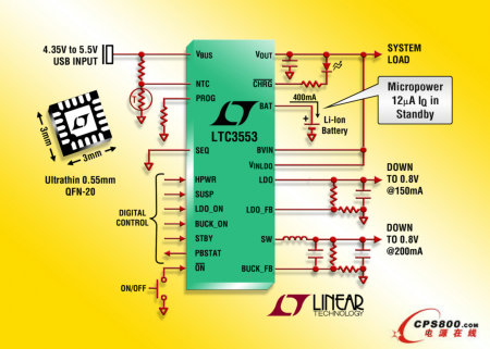 凌力爾特公司 (Linear Technology Corporation) 日前推出微功率多功能電源管理集成電路 (PMIC) 解決方案 LTC3553,該器件適用于基于鋰離子/聚合物電池的便攜式應用。LTC3553 在超薄 (0.55mm) 3mm x 3mm QFN 封裝中集成了一個 USB 兼容的線性電源通路(PowerPath™) 管理器、一個獨立的電池充電器、一個高效率同步降壓型穩壓器、一個低壓差線性穩壓器和按鈕控制器。引腳可選的備用模式將電池漏電流降至僅為 12uA,同時保持所有輸出處于穩定狀態,從而延長了電池工作時間。LTC3553 非常適用于低功率便攜式設備應用,包括個人導航設備 (PND)、媒體播放器、以及手持式醫療和工業設備。