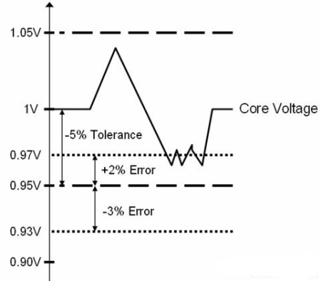 許多廉價的電壓.集成電路通常有一個被忽視的負作用,對于電壓變化,.的閾值將影響整個系統的容差。圖2說明了這種情況。核心電壓的規格為1V+/-5%,如果CPU核心電壓低于0.95V,就要求.必須發出一個中斷信號。然而,考慮到.的閾值精度,電壓變化的整個容差降低了。在這個例子中,該.的閾值為0.95V+2%/-3%(0.97V至0.93V)。采用這種監控集成電路時,該閾值應設置成0.97V ,這就限制了DC/DC轉換器的容差。