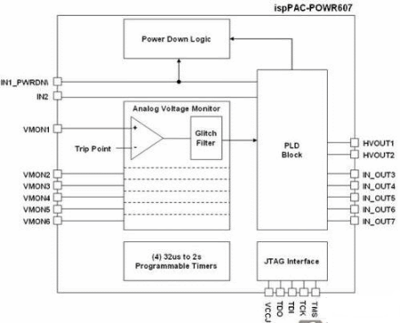 Power Manager II POWR607器件的6個電壓.(VMON)都是獨立可編程的。斷點比較器提供192可編程點,整個范圍為0.667V到5.811V。當電源關閉之后,每個都提供一個75mV零檢測選擇,以確定電源輸出是否已經衰退到無效的情況。如果被監測的電壓大于斷點設置,每個比較器輸出一個邏輯高電平至可編程器件塊。比較器提供設定點的滯回約1%,以減少由電路板引入的輸入噪聲造成的誤觸發,以及由于開關電源而引起的正常電源紋波。過電壓和欠電壓電壓斷路點是可編程的,反映了被管理的DSP/FPGA/微機的容差。每一個電壓.提供一個數字濾波器,可以延時比較器的輸出,以避免假的觸發條件。針對CPU的看門狗定時器功能,該器件提供一個內置的振蕩器和可編程定時器電路,設定時序間隔范圍為32微秒到2秒。