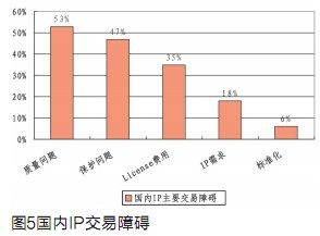 根據我們對92家芯片設計企業的問卷調查,IP質量、IP保護和IP費用是目前國內IP核交易中的主要障礙。(見圖5)