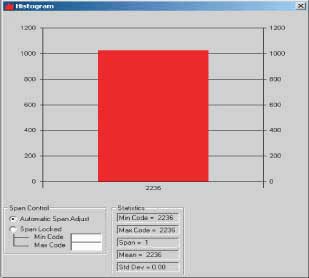 在最壞的情況下,在沒有采取抑制噪聲的預防措施時,圖2所示的12位系統對DC輸入信號的輸出代碼分布很散。圖3顯示了從轉換器輸出的數據。