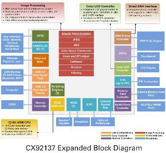 CX92137 采用了改進成像處理速度和質量的先進成像硬件。全新的 SoC 包含一個高性能 ARM 32 位核和一個集成的內存管理單元(MMU),為高速成像應用提供所需的處理能力。該 SoC 還包含存儲卡控制器、觸摸屏支持、支持高分辨率成像的彩色 LCD 控制器,以及支持用戶在電視上瀏覽照片集的 HDMI 發射器。
