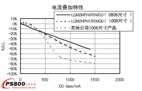 通過直流電流后感值偏執特性良好,可以作為各功率電感的特長。電流-感值偏執特性是指功率電感通電時,電流變大引起感值下降的性質。這是疊層型功率電感的封閉磁路構造導致的磁通量飽和引起的,因此為了克服這個弱點,開發新技術以降低疊層鐵氧體中的磁通量分布,從而改善電流的疊加特性,最后反映在各個產品上。