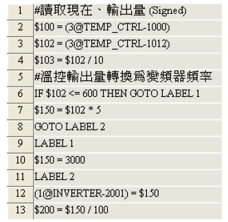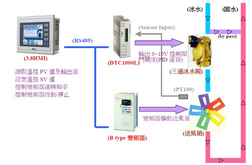 在大樓或廠房的中央空調系統中,大部份的架構是由冰水主機制造冰水后再流經各區域的送風箱送出冷空氣。一般傳統的控制上,是以變頻器對送風箱馬達做變頻(變轉速)的控制,以控制出風量的大小。而單使用風量的調節是無法達到恒溫的要求,只能適時的減低轉速以減少冷房出力及降低馬達本身電能的浪費。因此恒溫控制上,則必需同時把冰水閥門的開度一起納入控制架構中以適時的調節冰水的流量,此時再配合溫控器上的PID 運算即可對馬達轉速及冰水閥的開度做相互配合而完成定溫控制的目地。