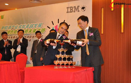 IBM大中華區(qū)副總裁姜錫岫(右)與陽光電源總經(jīng)理曹仁賢(左)慶祝簽約成功