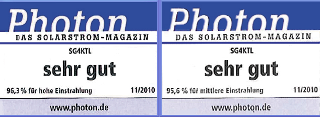 SG4KTL光伏并網逆變器是SUNGROW (陽光電源)今年面向全球主流市場推出的全新產品系列SG3KTL/4KTL/5KTL中的一款,流線型的設計和清晰的人機界面給用戶的使用和安裝提供了最大方便,在最為重要的轉換效率上,經過Photon的測評,在中等輻照和高輻照的條件下,SG4KTL分別達到了95.6%和96.3%,均高于行業平均水平;最大功率跟蹤電壓范圍,也表現良好,能夠穩定在210-420之間。憑借測試中的優異表現,SG4KTL最終獲得Photon的A級評定。