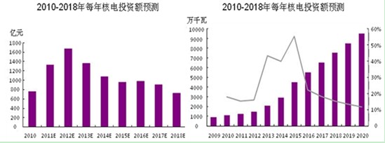 2007年《核電中長期發展規劃》制定了2020年前核電總裝機4,000萬千瓦的目標,而目前已投入運營的核電機組總裝機容量為910萬千瓦,在建核電機組總容量為2,500萬千瓦,共3,500萬千瓦,可見,近期再次上調核電規劃的可能性非常大,樂觀估計很可能將2020年核電總裝機目標上調至8,000萬千瓦,這樣將會給核電產業帶來巨大的投資機會。未來10年核電市場總投資額將達到9,800億元,年平均投資額接近1,000億元。