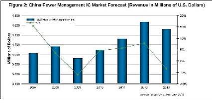 預(yù)計(jì)2009年中國(guó)PMIC營(yíng)業(yè)收入降至39億美元,比2008年時(shí)的42億美元減少6%。但是,由于中國(guó)總體半導(dǎo)體市場(chǎng)復(fù)蘇和國(guó)內(nèi)需求巨大,預(yù)計(jì)該市場(chǎng)到2012年將增至47億美元。