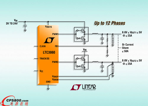 差分放大器提供對 VOUT 和接地端的真正遠端輸出電壓檢測,從而在由于過孔、走線和互連線而產生 IR 損耗的場合實現高準確度的調節。LTC3860 工作于 3V 至 5.5V 的 VCC 電壓、3V 至 24V 的 VIN (高端 MOSFET 的漏極電壓) 和產生 0.6V 至 5V 的輸出電壓。該器件的電壓模式控制架構允許選擇從 250kHz 至 1.25MHz 的固定工作頻率,或者它可以通過其鎖相環 (PLL) 同步到同樣范圍的頻率上。通過監視輸出電感器 (DCR) 兩端的壓降檢測輸出電流,以實現最高效率,或利用檢測電阻器檢測輸出電流。其可調電流限制可以為實現非常低的檢測電壓 (0mV 至 50mV) 而配置,以最大限度降低功率損耗。LTC3860 的電流均分環路在多個 IC 的 DC 和負載瞬態相位之間實現準確的電流均分。