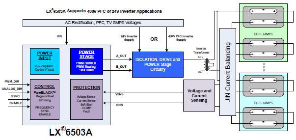 LX6503A控制器在一個芯片中集成了LCD TV/顯示器背光控制所需要的全部功能,另外還提供了可靠的燈管起動和全面的亮度控制模式,并可以支持現行背光應用中的24V逆變器電路拓撲。同時,與對應的競爭方案相比,LX6503A控制器具有更高的電流控制精度。