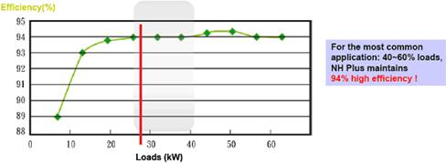 通常帶載越少,UPS效率越差。而HIFT(海福)UPS,即使帶載只有額定容量的15%,整機效率亦超過90%;當帶載達到27%時,效率就已高達94%。效率在百分比上的每一小步提升,能耗支出的節省都是一大步。