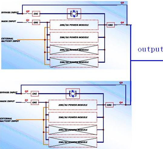 海口市人民醫院UPS建設主要是為是為了保障機房內弱電系統的核心設備的長期、穩定不間斷運行的需要而設立的,一來通過UPS電源系統來對電網的電壓信號進行穩定,以提供給核心設備更為穩定的工作電壓,同時在停電時,發電機啟動之前的這些時間內,弱電機房的核心設備是不能停止運行的,需要UPS給予及時的供電,以保障核心設備的不間斷工作需要 。由于負載的重要性,客戶規劃時,要求采用1+1冗余并聯的方式為負載提供高可靠的供電系統。