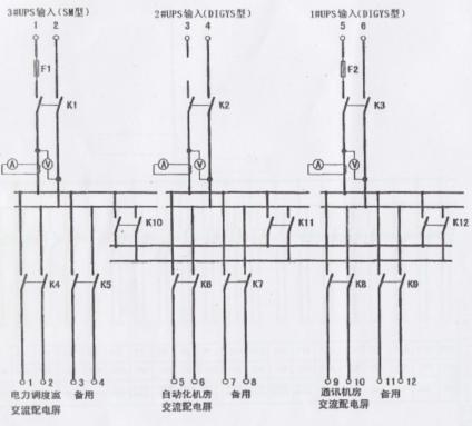 c. 如圖二所示,整個存在一個共同的維修旁路(由K10、K11、K12組成)。由于三臺UPS的交流輸入分別來自不同兩路市電,,所以存在不同市電回路短路的危險,真正維護時也無法實現不停電維護。同時也存在因人員操作,引起短路的危險。