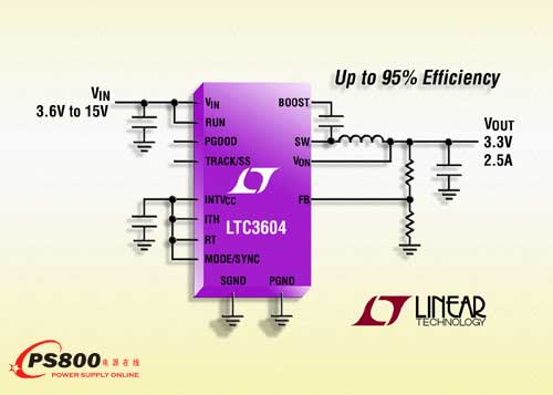LTC3604 采用 RDS(ON) 僅為 100mΩ 和 130mΩ 的內部開關,以提供高達 95% 的效率。其獨特的控制架構使它能夠實現低至 5% 的占空比,同時保持開關頻率高達 2.25MHz,從而使其非常適用于高降壓比應用 (例如:12VIN 至 1.2VOUT 轉換)。采用突發模式 (Burst Mode®) 工作可最大限度地提高輕負載效率,從而僅需要 300uA 電流 (在無負載時),并使 LTC3604 非常適用于需要最長電池運行時間的應用。對于需要最低噪聲的應用來說,LTC3604 可配置以強制連續模式運行,以實現最低噪聲和最低的潛在 RF 干擾。其它特點包括電源良好電壓監視器、輸出電壓跟蹤功能和短路保護。