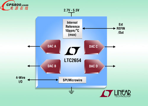 LTC2654 的集成式基準實現了典型值為 2ppm/°C 和最大值為 10ppm/°C 的溫度系數。它采用纖巧 20 引腳 4mm x 4mm QFN 封裝和 16 引腳 TSSOP 封裝,從而可為密集排列的電路板節省空間。AC 性能非常卓越,因為 LTC2654 就半標度步進而言提供 8.9us 的穩定時間,串擾為 3nV•s,從而使得 DAC 通道之間的干擾最小。LTC2654 用單一 2.7V 至 5.5V 的電源工作,通過高達 50MHz 的 4 線 SPI/Microwire 兼容接口通信。