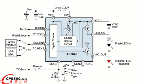 這些特點適合照相手機閃光燈的需要,尤其是智能手機和多功能手機。對于數碼相機、便攜式攝像機及掌上電腦等其他設備而言,AS3645閃光燈驅動器也是一個完美的解決方案。其采用軟啟動的高效2 MHz固定頻率DC-DC升壓轉換器只需要小型電感器,可以方便地集成到噪聲敏感的RF系統中。高功率LED閃光燈電流源有閃光、火炬和協助(視頻)光模式。附加的電流源能夠驅動一個可選LED指示燈。控制可通過并行接口模式實現,以達到簡單的集成,或通過I2C接口模式更加全面地控制電流和時間等所有設置。接口可通過專用引腳(I2C/EN)選擇。
