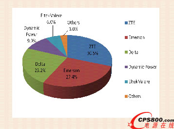 綜合分析三大運營商的集采結果,2009年,中興、艾默生及中達三家廠商處于市場第一陣營。以出貨量計,中興通訊以30.5%的占有率排列中國通信電源市場第一。