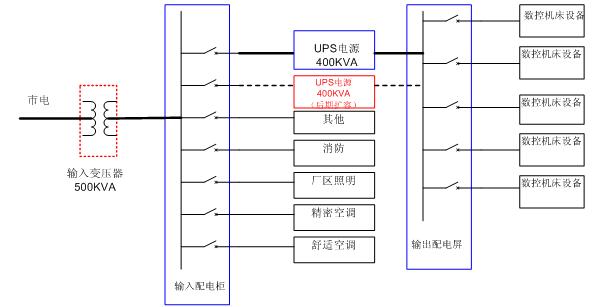 我們建議規(guī)劃為UPS集中供電的解決方案,采用1臺UPS的輸入交流可以選擇采用輸入配電柜供給UPS市電輸入,再經(jīng)過UPS電源的單機系統(tǒng)給輸出配電柜供電,重要關鍵負載(穩(wěn)壓器、數(shù)控機床設備)全部由UPS輸出配電柜配電供電,次要負載(廠區(qū)照明設備、空調(diào)設備、消防設備等)全部由輸入配電柜配電供電。