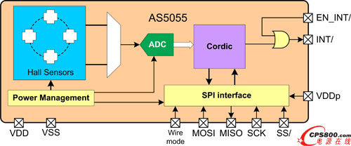 編碼器系統的組裝只需要少量片上無源元件和1個旋轉磁鐵。AS5055能夠完成全部的角度計算及片上自動上電和斷電。僅當主控制器需要新的測量時它才吸收電流。一旦測量的采集完成,AS5055則自動暫停而斷電。
