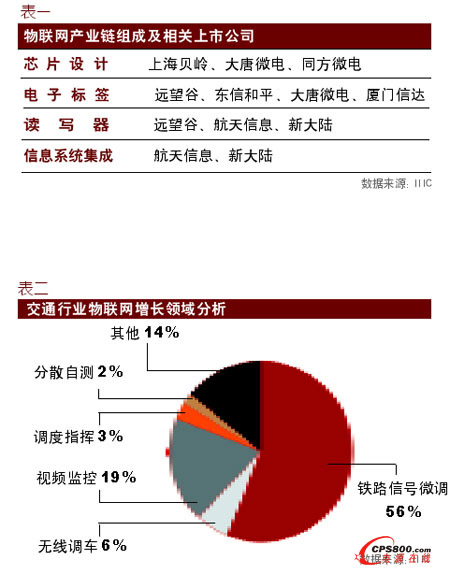 物聯網是繼計算機、互聯網后,信息產業又一次重大變革。物聯網(M2M)被認為是“下一代網絡”發展中最重要的應用之一。從產業鏈結構來看主要包括:芯片設計,應用設備(電子標簽,讀寫器),系統集成和軟件,電信運營商和服務提供商(見表一)等5大部分。與通信產業不同的是,物聯網的終端是數以萬億計的設備或物品,由此產生了巨大的市場容量和無限的發展空間。未來行業的爆發點將集中在智能監控、智能電網、智能交通和智能物流等領域。以交通為例,未來該領域內物聯網產業的高速增長將取決于視頻監控和防災等業務。