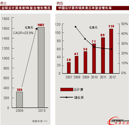 物聯網大規模發展后產生的數據量將會遠遠超過互聯網的數據量,海量數據的存儲與計算處理需要云計算技術的應用;未來5年云計算的全球市場空間將超過1500億美元,復合增長率可達到23%以上,而中國云計算市場未來三年的復合增長更是達到27%。(見表三、表四)