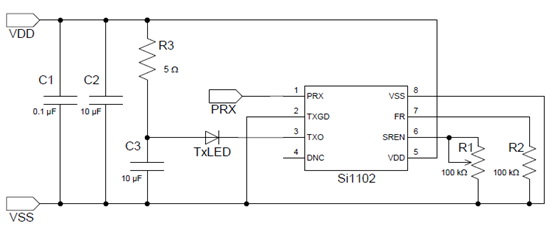 Si1102是一個可獨立工作的紅外接近傳感器,能驅(qū)動單個紅外LED。LED發(fā)射的紅外線經(jīng)過接近物體反射到達內(nèi)置的紅外線光電二極管被接收,然后經(jīng)過信號的放大并進行信號處理,最后通過與一個設(shè)定的探測門限值比較輸出一個相應邏輯電平,如果測量的結(jié)果高于這個門限值則從PRX口輸出一個低電平。利用這種電平信號的輸出可以用來作為其他工作的驅(qū)動或者是做MCU的中斷輸入,進而實現(xiàn)近距探測功能。