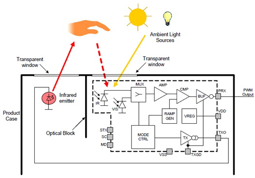 Si1102和Si1120 紅外接近傳感器主要由一個紅外LED驅(qū)動器,紅外線光電二極管,一個環(huán)境光傳感器(僅Si1120具有)和控制邏輯IC組成,外部的發(fā)射LED可以根據(jù)用戶的需要靈活安裝和配置。如圖1所示。