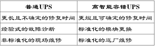 從以上兩點結合可用性公式可以看出,模塊化UPS具有最高的可用性,也就是說其容錯能力最強。具有低成本、高效率、高可靠性,并且能夠快速修復的容錯性UPS必將成為UPS的發展趨勢。