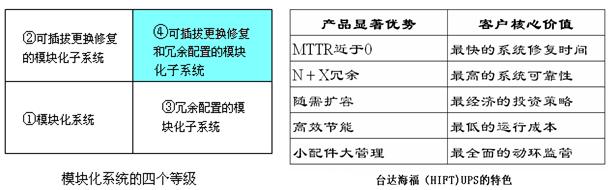 容錯的核心是系統內部資源冗余,而資源冗余的技術支撐是模塊化。串聯熱備份、并聯冗余,雙總線甚至三總線等方案正是通過各UPS間的相互冗余達到系統容錯的。但是為達到這一目的所付出的采購、運營和維護成本等代價也是昂貴的,并且即便如此,仍然不一定滿足人們對“故障UPS快速修復”的需求,因為這些系統的模塊化程度還不夠高。以臺達海福(HIFT)系列UPS為例,真正的模塊化UPS在容錯方面具備下述優點: