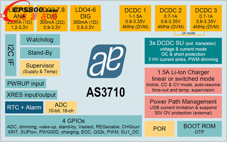 AS3710和AS3711都包含三個4MHz的DC-DC降壓轉換器、兩個DC-DC升壓轉換器、8個LDO、4個GPIO、1.5A充電器、I2C、3個電流阱、ADC、監視器以及實時時鐘。AS3710芯片增添了第三個升壓器,而AS3711則增加了3A降壓轉換器。配置選項包括選擇線性或開關進行充電,最大限度提升效率并降低空間需求和成本。