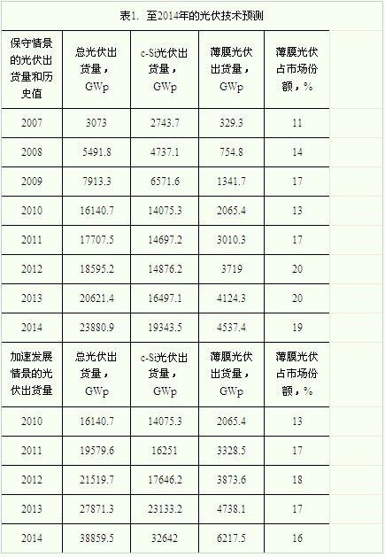 在2010年,全球光伏出貨量超過16GWp,薄膜光伏占市場13%的份額。2010年,碲化鎘(CdTe)光伏增長了兩個百分點,而多晶和與單晶硅光伏下降一個百分點。表1列出了至2014年的光伏技術預測。