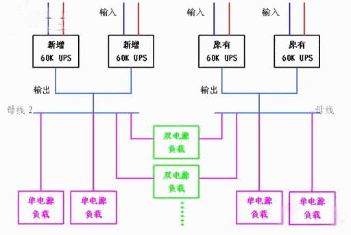 ⑴ 某機房內由一套60KVA UPS“1+1”冗余并聯供電,隨著業務量的快速發展以及對數據機房的高度重視,原有的雙機冗余供電系統容量已經滿足不了現有的設備需求量,需新增加一套60KVA UPS 2臺并聯冗余供電系統。