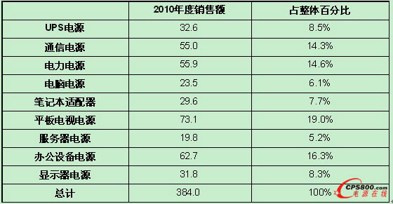 表2  2010年度部分重點(diǎn)電子電源產(chǎn)品銷售額分析(單位:億元)