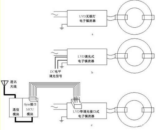 a. 普通220V 市電電子鎮流器; b. 自配調光控制器的調光電子鎮流器; c. 匹配通訊模塊的調光電子鎮流器