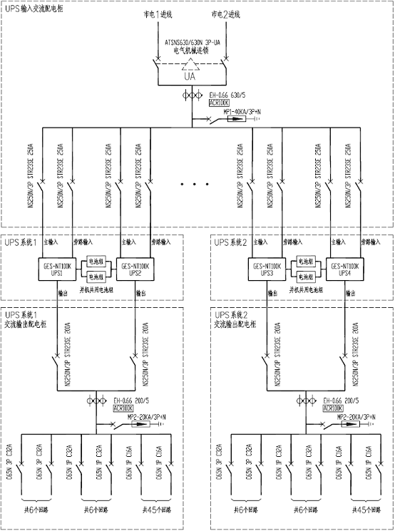 為保證數(shù)據(jù)中心機(jī)房內(nèi)所有設(shè)備24 小時不間斷優(yōu)質(zhì)供電,數(shù)據(jù)中心機(jī)房供電系統(tǒng)采用兩路在線式UPS供電(每路均為1+1并聯(lián)冗余配置,提高供電系統(tǒng)的冗錯性和可靠性),UPS采用中文操作界面,根據(jù)系統(tǒng)設(shè)備用電功率,設(shè)計為4臺100KVA,實(shí)現(xiàn)獨(dú)立的雙總線供電方案,提高供電的可靠性、容錯性,滿足GB50174-2008《電子信息系統(tǒng)機(jī)房設(shè)計規(guī)范》A級機(jī)房電源設(shè)計標(biāo)準(zhǔn)。