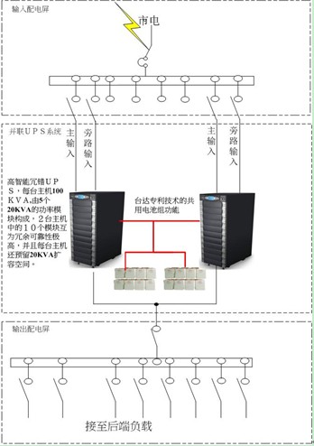 臺達海福系列UPS可采用共享電池組方案。所謂共享電池組就是指兩臺或多臺UPS同時利用一組或多組電池的解決方案。市電正常時各臺UPS同時為蓄電池組充電,市電異常或者終斷時,各UPS又同時利用電池組的能量逆變成交流電供給負載使用。整個系統具備1+1并機冗余系統的優勢外,還可以為用戶節省投資,減小占地,減少運營成本等優點,所以并機系統共用電池組也逐漸的被很多用戶采納。
