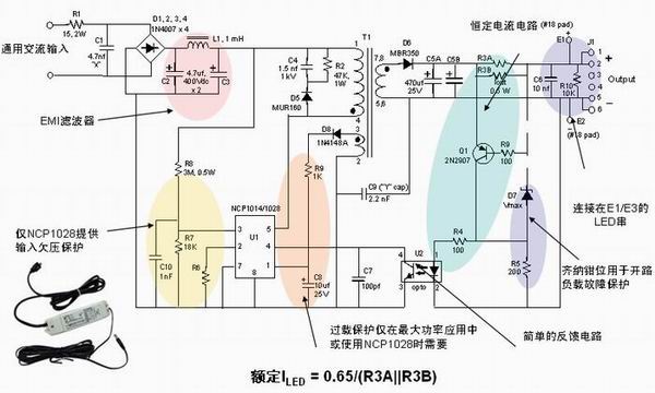 圖1:安森美半導體離線式第二代LED驅動器NCP1014/1028的應用示意圖。