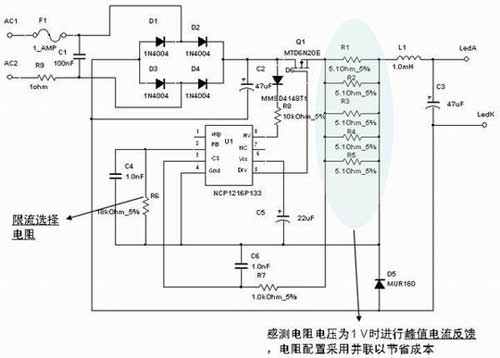 圖3:采用峰值電流控制的NCP1216非隔離型離線式LED驅動應用。
